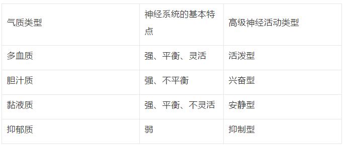 西方医学奠基人希波克拉底认为人体内有四种体液:血液、黏液、黄胆汁和黑胆汁。根据人体内的这四种体液的不同配合比例,将人的气质划分为四种不同类型:多血质、黏液质、胆汁质、抑郁质。